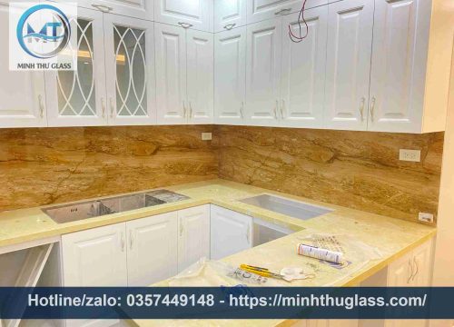 • Kính ốp bếp vân đá: Mang đến vẻ đẹp sang trọng, đẳng cấp như đá tự nhiên nhưng dễ dàng vệ sinh hơn.